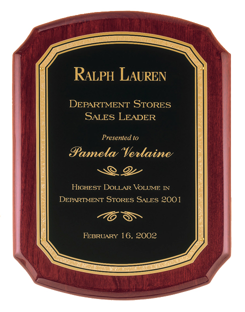 Cherry finish plaque with cascading gold swirl design engraving plate.